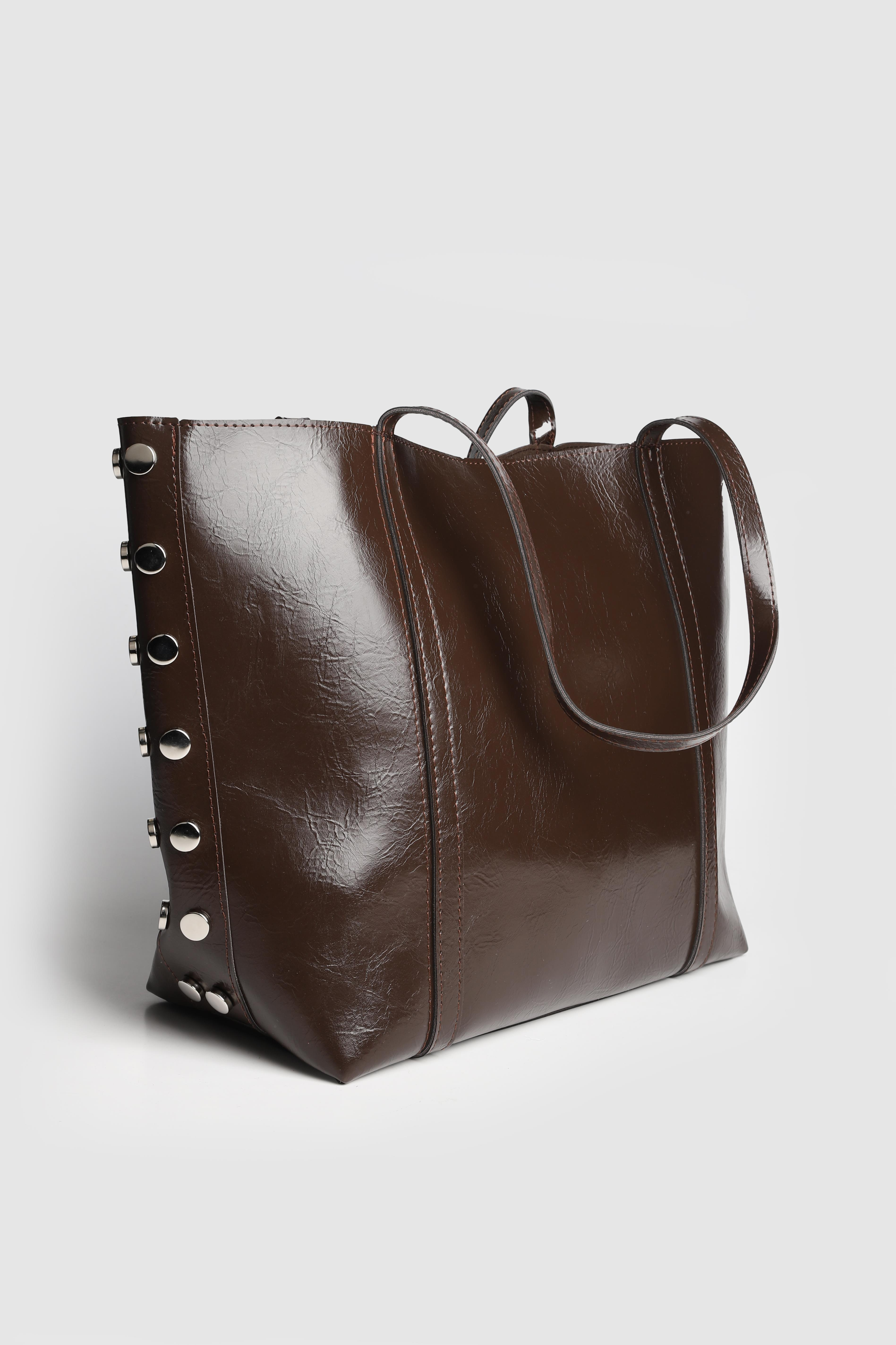 Lagraccio Paris Kadın Geme Zımba Detaylı Büyük Boy Omuz Çantası Kırışık Kahve