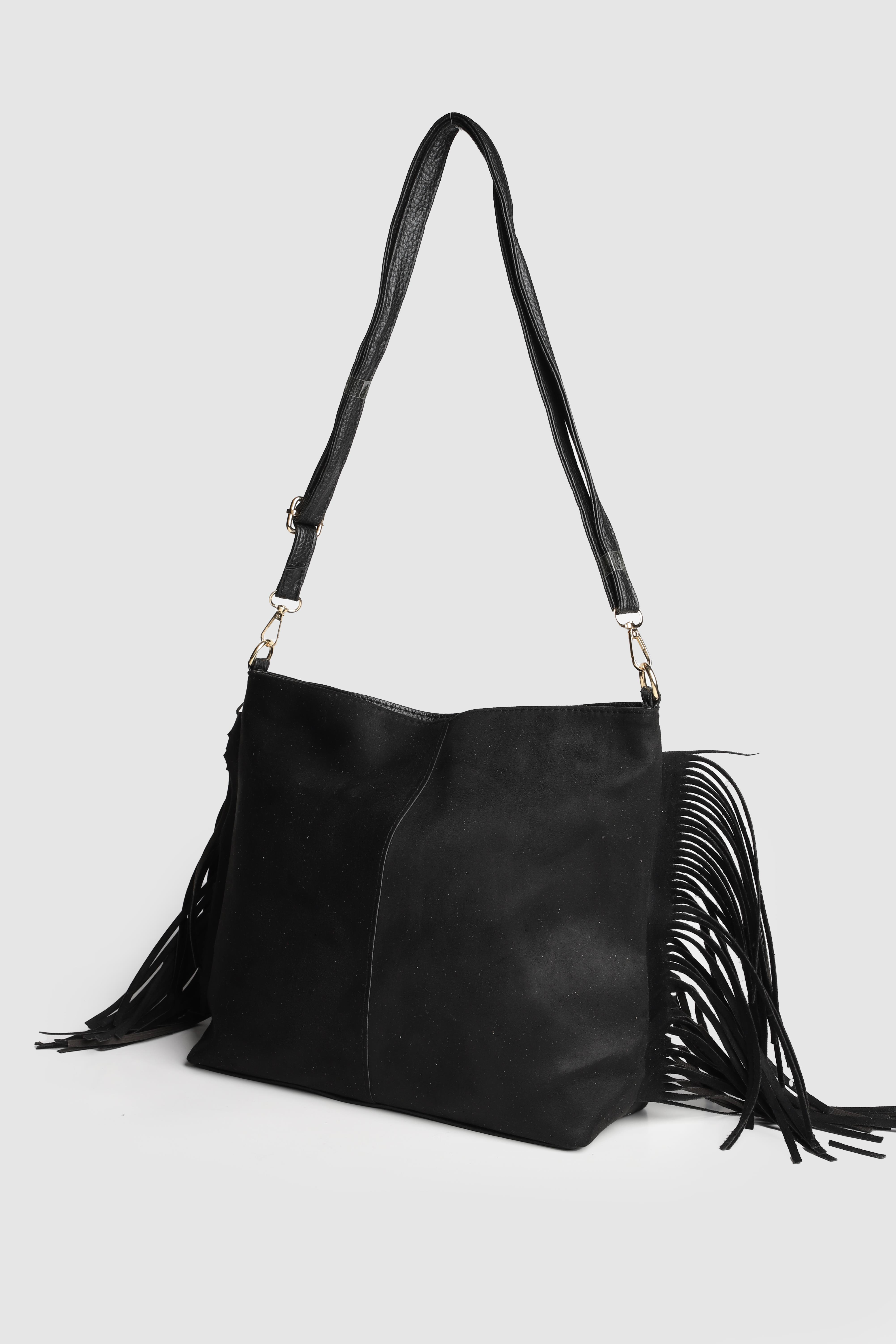 Lagraccio Paris Kadın Guts Süet Püsküllü Omuz Çantası Siyah Süet (Lagraccio2728)