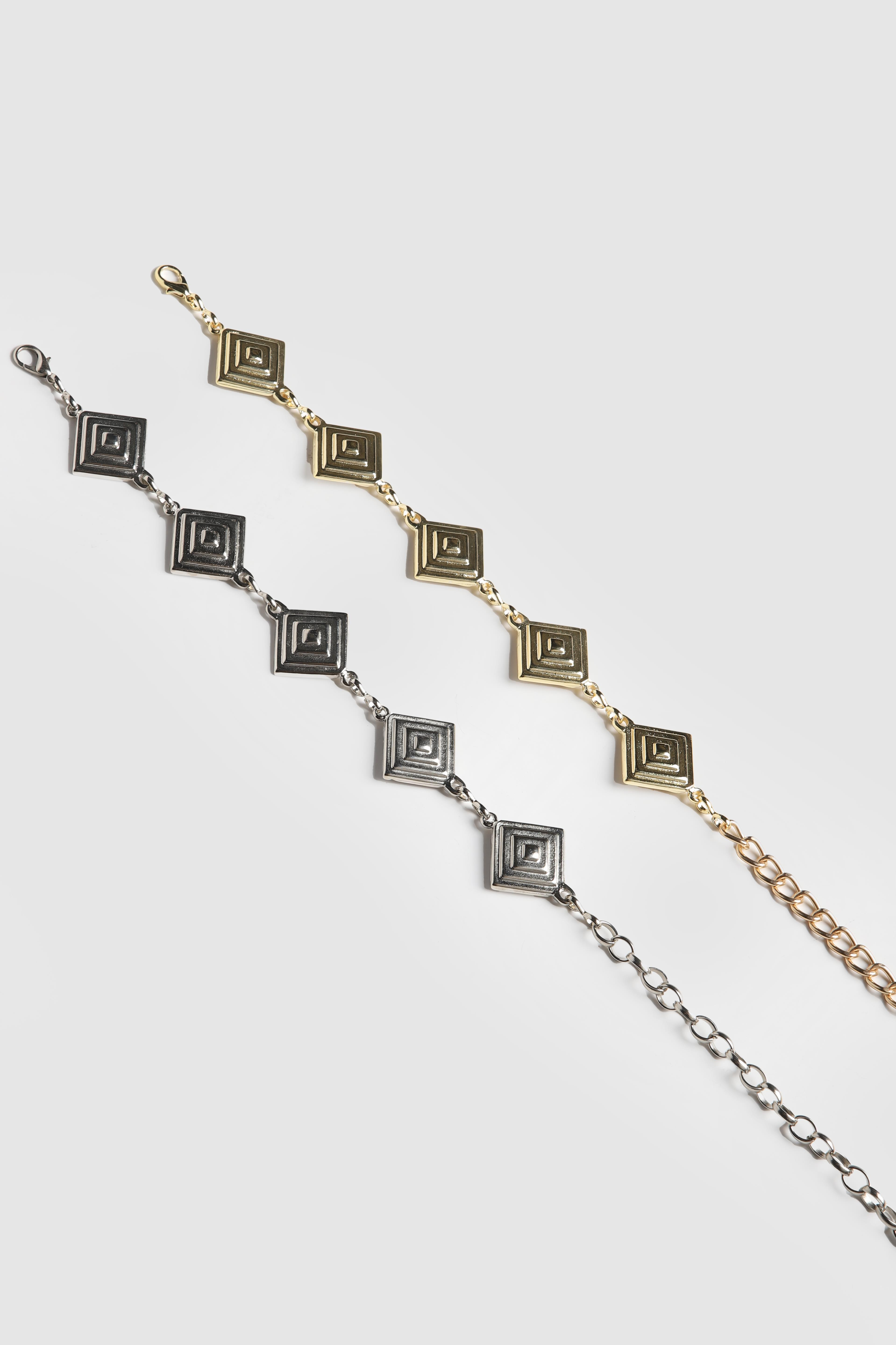 • Simetrik deseniyle süslenmiş, zarif ve şık bir görünüm sunan zincir kemer.